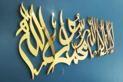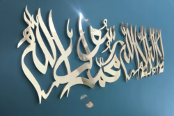 Shahada Kalima Calligraphy – The sacred Islamic declaration of faith, beautifully crafted into a stunning 3D stainless steel wall art. This elegant and modern Islamic calligraphy piece serves as a symbol of faith, making it an exquisite addition to any home, mosque, or office.